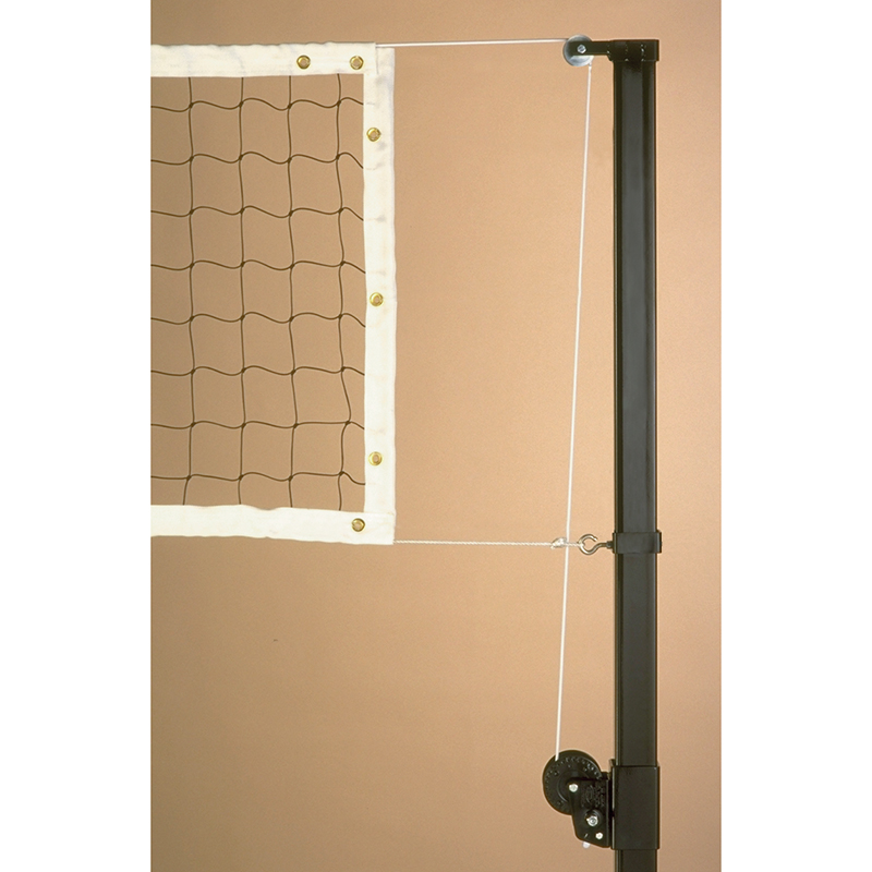 The VB-1200RB competition net meets USVBA standards, measuring 36″ in height and 32′ length. Black netting is 3.0 mm in standard 4″ square. Perimeter bands are constructed from 2.5″ wide 20 oz white vinyl. The nets are braced with fiberglass dowels. The top cable is 41′ in length and is vinyl-coated steel with 3600 lb. break strength. Headband cable ends are double-pressed for strength—6 mm Rope in the bottom net band.